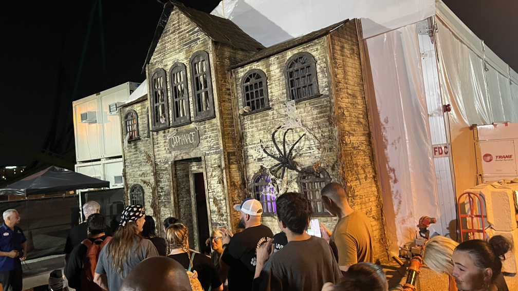 Once we got off of the roller coaster, we met up with our friends at Full Throttle, and then went over to The Widow’s Nest. I think this was one of my favorite houses, because it was supposed to be a decaying and insane orphanage. I really loved the building facade of the house, with it being an old building, and I thought the moving stroller outside of it was a pretty cool touch. This house they did a really great job at creepy, which is why I thought this was one of the better houses.